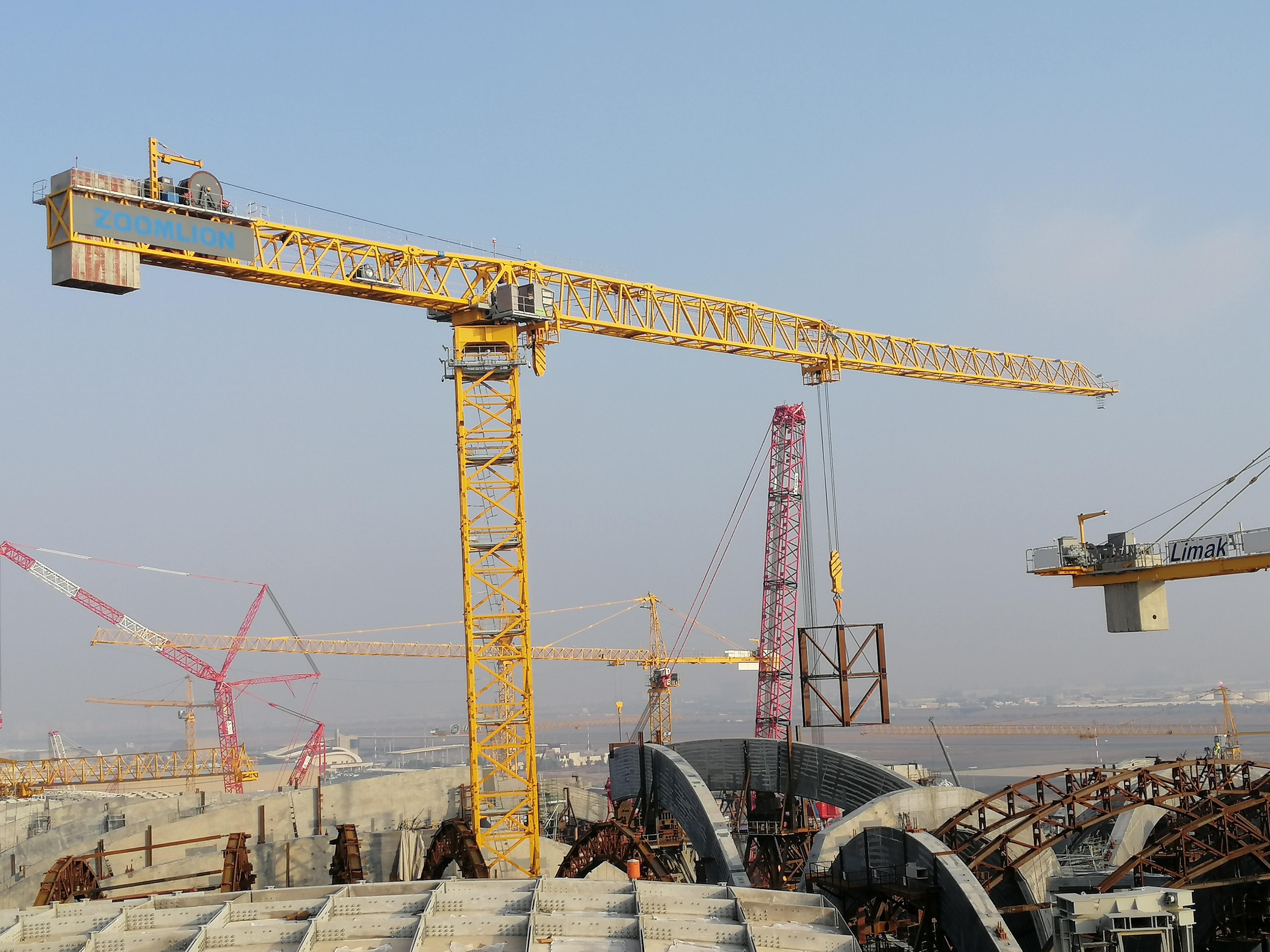 資料顯示,科威特新機場是該國的主要項目之一,預(yù)計工期為6年。新機場的容量為年1300萬人次,后期會增加至2500萬人次。該項目將有助于將科威特打造成為重要的區(qū)域中心。新機場航站樓的核心區(qū)域為一個巨大的穹頂,使用鋼結(jié)構(gòu)和混凝土PC構(gòu)件組成,施工頗具挑戰(zhàn)性。鋼構(gòu)件銜接吊裝對塔機的起升平穩(wěn)性和微動性有極高要求;混凝土PC構(gòu)建單件物件重,除了需要塔機具有良好的微動性能外,還要有強大的起重能力;此外,作為航站樓的中心部分,吊裝物料重、工作量大,對塔機的穩(wěn)定性也提出了較高的要求。