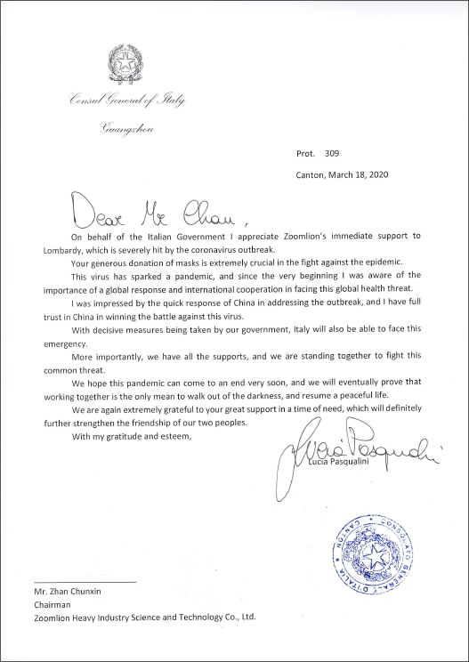 ? ?3月18日,一封由意大利駐廣州總領(lǐng)事館發(fā)出的,承載著意大利政府感謝與敬意的信函,被傳送到長(zhǎng)沙中聯(lián)重科。