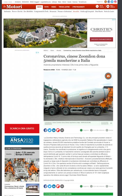 △安莎社積極報(bào)道中聯(lián)重科向意大利捐贈(zèng)口罩