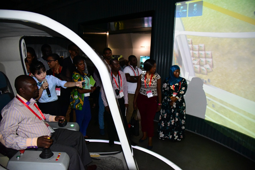 △海外參觀者在中聯(lián)重科工程機(jī)械館內(nèi)體驗(yàn)塔機(jī)模擬操作