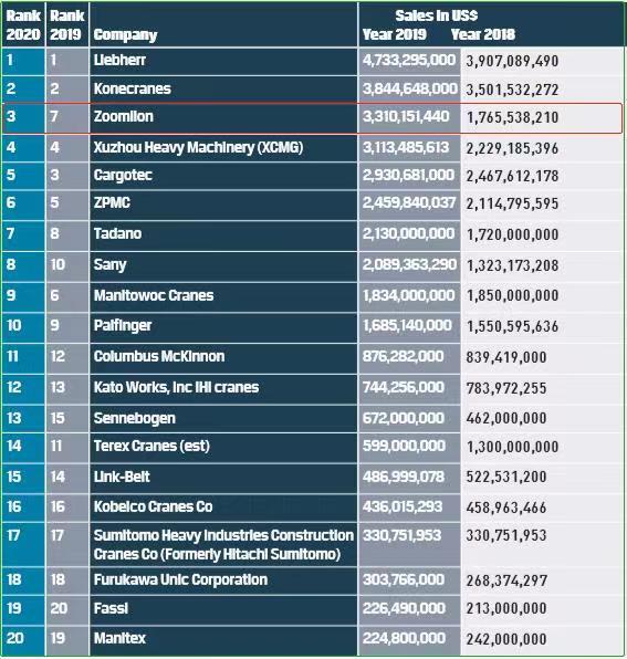 △中聯(lián)重科位列全球起重機(jī)械制造商20強(qiáng)排行榜**三