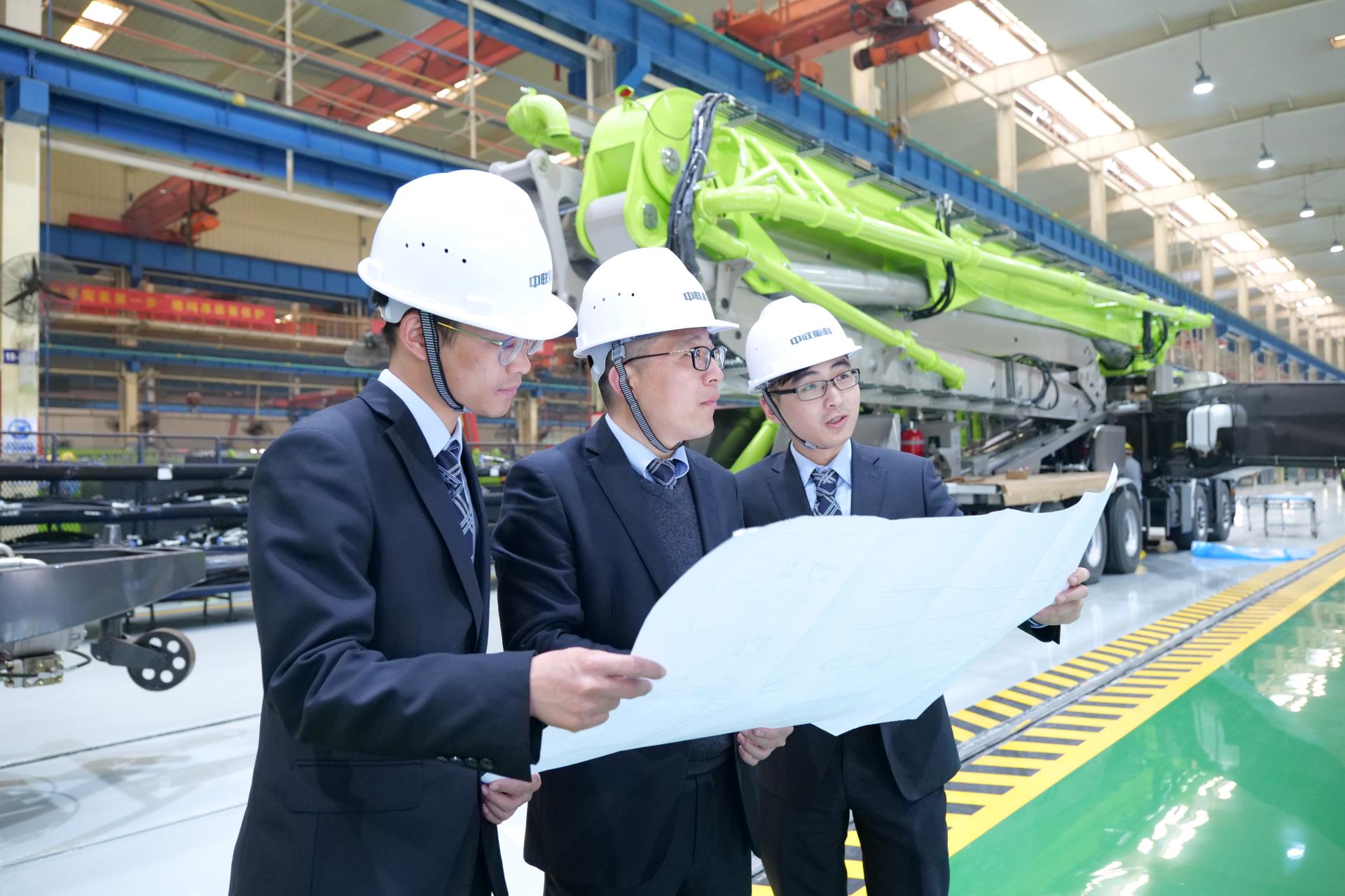 中聯(lián)重科混凝土泵送機(jī)械分公司研發(fā)中心經(jīng)理高榮芝(左一)在車(chē)間研究泵車(chē)裝備。朱莉 攝