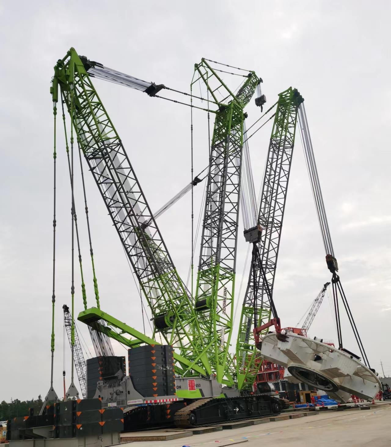 吊起重達(dá)308噸的刀盤(pán),并完成“翻身”、下井等一系列操作,不僅需要起重能力強(qiáng)大、性能穩(wěn)定的重器,兩臺(tái)設(shè)備之間還需要配合無(wú)間,對(duì)工況的適應(yīng)性強(qiáng)。經(jīng)過(guò)多方考慮,施工方**終選擇了中聯(lián)重科的QUY650履帶起重機(jī)和ZCC7200履帶起重機(jī)。在現(xiàn)場(chǎng),QUY650履帶起重機(jī)作為主吊設(shè)備,采用超起盾構(gòu)36米主臂+12米副臂工況,ZCC7200履帶起重機(jī)積極輔助,采用超起重型主臂42米工況。在兩臺(tái)履帶起重機(jī)的緊密協(xié)作、配合下,“申通號(hào)”盾構(gòu)機(jī)刀盤(pán)被緩緩從地面吊起,并完成翻身,隨后起重機(jī)將刀盤(pán)吊平穩(wěn)至井口,大約歷時(shí)3小時(shí),“申通號(hào)”盾構(gòu)機(jī)刀盤(pán)順利下井。