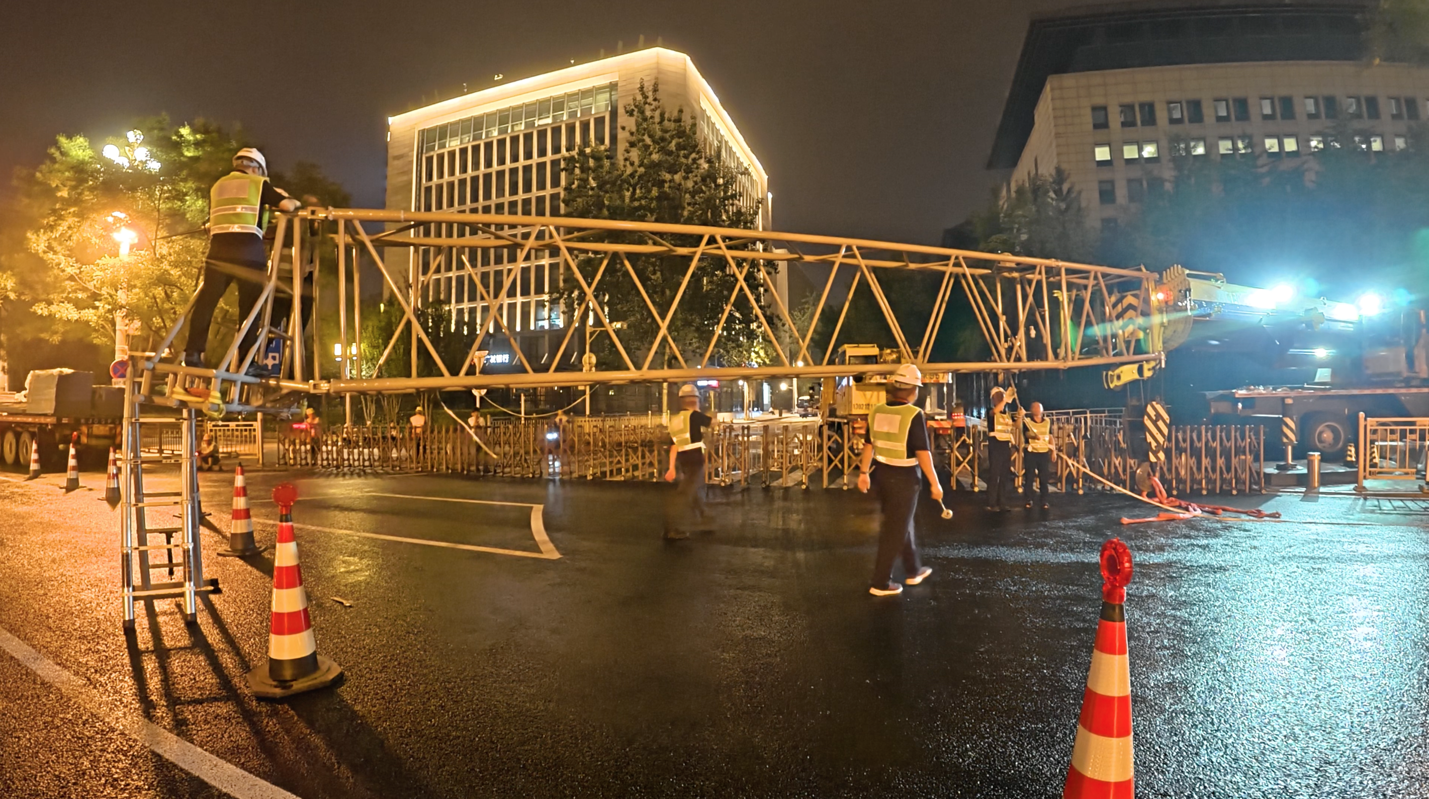 △在長安街南側(cè),兩臺中聯(lián)重科汽車起重機架設(shè)天琴座拍攝系統(tǒng)