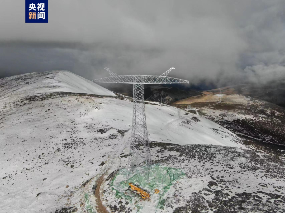 △四川省甘孜州巴塘縣德達鄉(xiāng)色烔瑪山上的金上—湖北特高壓工程鐵塔(圖片來源:央視新聞)