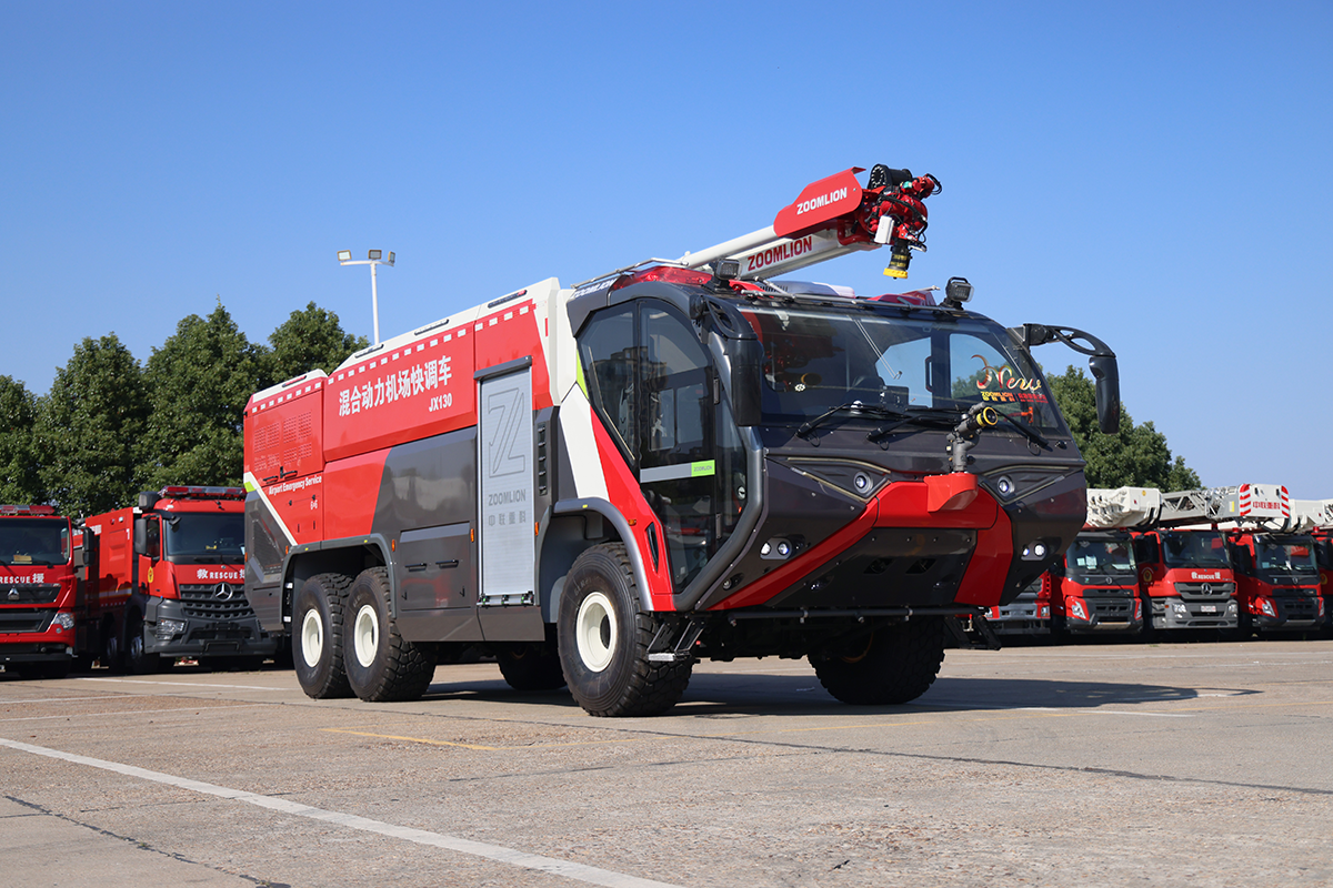中聯(lián)牌JX130是國內(nèi)首款混合動力驅(qū)動的機場快調(diào)消防車。該車采用雙動力驅(qū)動,具備超強的行駛加速性能;配有大容量滅火劑罐,搭載智能的滅火噴射系統(tǒng)和高強度穿刺臂,快速撲救飛行器火災(zāi),是各類機場必備的火災(zāi)救援核心裝備。