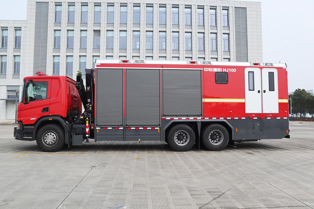 ? ? ? 中聯(lián)重科HJ100化學(xué)救援消防車是公司基于斯堪尼亞P500 6×4高性能底盤打造,集化學(xué)洗消、搶險(xiǎn)救援、照明、重型起吊等多功能于一體的多功能救援平臺(tái)。該車采用輕量化鋁合金車身結(jié)構(gòu),配備國(guó)際頂級(jí)子系統(tǒng)(包括比利時(shí)TEKLITE照明系統(tǒng)、冠軍7.5噸級(jí)電動(dòng)絞盤、希爾博起吊機(jī)等),可搭載100余件專業(yè)救援器材,集化學(xué)洗消、照明、供電、牽引、起吊、破拆、偵查、救援等功能于一體的多功能消防車;具備強(qiáng)大的搶險(xiǎn)和化學(xué)救援能力,可滿足化學(xué)泄漏、地震災(zāi)害、洪澇事故、車禍等復(fù)雜場(chǎng)景下的綜合救援需求,是國(guó)內(nèi)領(lǐng)先的模塊化多功能救援平臺(tái)。