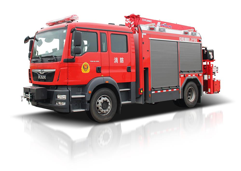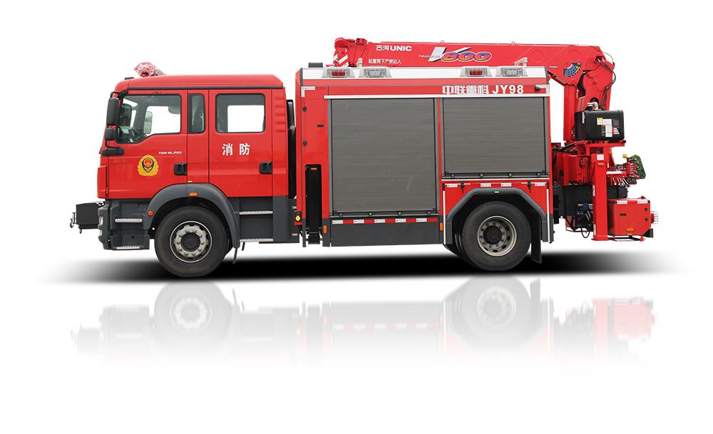 中聯(lián)重科JY98型搶險救援消防車,結(jié)合國內(nèi)外消防車的先進(jìn)理念和消防實戰(zhàn)創(chuàng)新設(shè)計而成,整車結(jié)構(gòu)緊湊,越障能力強,可裝備絞盤、升降照明系統(tǒng)、起吊機、液壓破拆工具組、偵檢器具、救生器具等超過98件搶險救援器材,是集照明、供電、牽引、起吊、破拆、偵查、救援等功能于一體的多功能消防車,具備強大的搶險功能和綜合救援能力,是火災(zāi)、地震、抗洪、車禍等各類災(zāi)害搶險救援的主力車型。