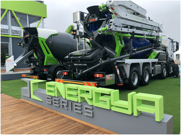 皆為CIFA本地化制造的明星產(chǎn)品,其中ENERGYA系列的MK28E攪拌布料泵車,為全球首臺插入式混合動力攪拌布料泵車,采用行業(yè)前沿的電動和柴油