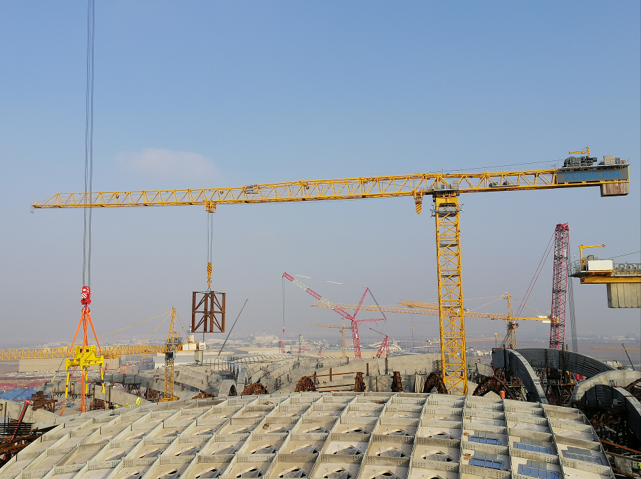 資料顯示,科威特新機(jī)場(chǎng)是該國(guó)的主要項(xiàng)目之一,預(yù)計(jì)工期為6年。新機(jī)場(chǎng)的容量為年1300萬(wàn)人次,后期會(huì)增加至2500萬(wàn)人次。該項(xiàng)目將有助于將科威特打造成為重要的區(qū)域中心。新機(jī)場(chǎng)航站樓的核心區(qū)域?yàn)橐粋€(gè)巨大的穹頂,使用鋼結(jié)構(gòu)和混凝土PC構(gòu)件組成,施工頗具挑戰(zhàn)性。鋼構(gòu)件銜接吊裝對(duì)塔機(jī)的起升平穩(wěn)性和微動(dòng)性有極高要求;混凝土PC構(gòu)建單件物件重,除了需要塔機(jī)具有良好的微動(dòng)性能外,還要有強(qiáng)大的起重能力;此外,作為航站樓的中心部分,吊裝物料重、工作量大,對(duì)塔機(jī)的穩(wěn)定性也提出了較高的要求。