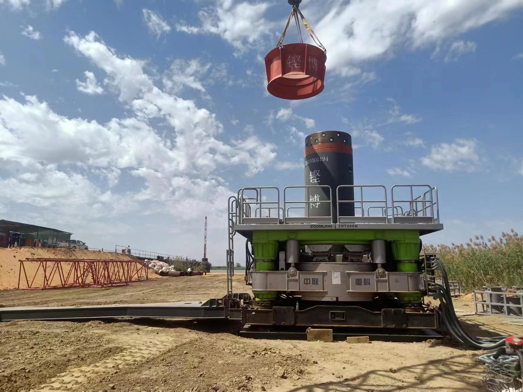 為了保護(hù)當(dāng)?shù)丨h(huán)境,業(yè)主方禁止使用化學(xué)泥漿護(hù)壁,因當(dāng)?shù)氐牡貙訛榧?xì)沙,旋挖鉆機(jī)因存在塌方風(fēng)險(xiǎn)無法成樁,客戶原打算用一次性護(hù)筒加震動(dòng)錘成孔,但成本過大,經(jīng)過綜合考量比較,采用了全回轉(zhuǎn)加護(hù)筒成孔工法,護(hù)筒可以重復(fù)使用以減少成本,并選用廣受好評(píng)的中聯(lián)重科全回轉(zhuǎn)鉆機(jī)承擔(dān)任務(wù)。