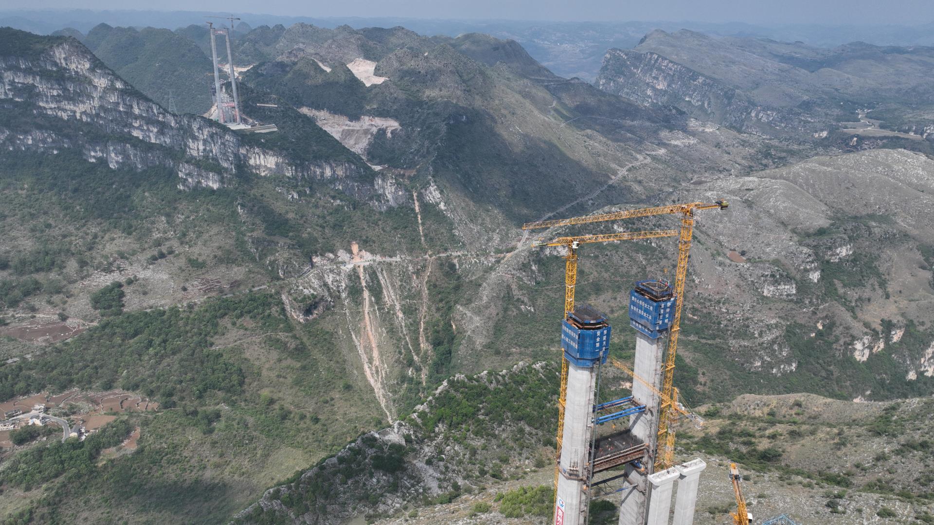 目前,2臺(tái)WA7527-20KB平頭塔式起重機(jī)已安裝到280米高度,在5號(hào)主塔與6號(hào)主塔隔峽相望,拔地而起的高柱聳立于懸崖峭壁,橋下的北盤(pán)江宛如藍(lán)色絲帶靜臥于大峽谷的懷抱中。
