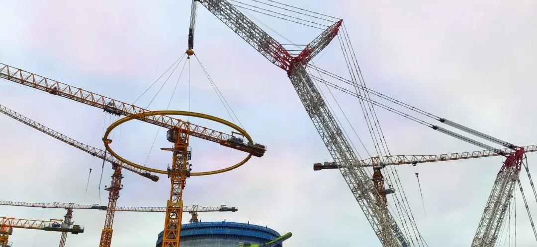 ▲中聯(lián)重科起重機正在吊裝昌江核電4號機組環(huán)梁環(huán)軌(圖片源于“華能昌江核電”公眾號)