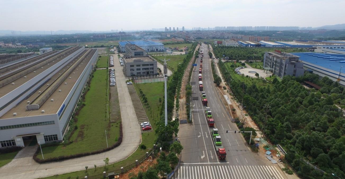 ▲中聯(lián)重科成套路面機(jī)械設(shè)備浩浩蕩蕩從望城工業(yè)園出發(fā)