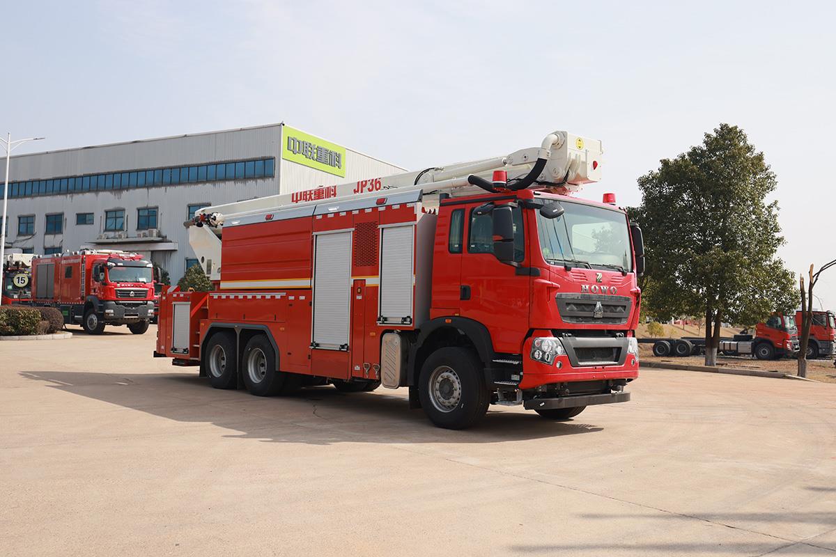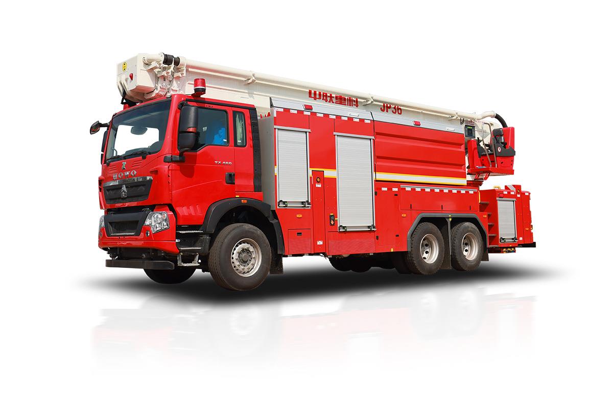 中聯(lián)牌36米舉高噴射消防車(以下簡稱高噴車)是一種消防高空滅火裝備,主要用于城鎮(zhèn)、工礦企業(yè)高層建筑以及石油、化工、油罐、倉庫等高大建筑物的火災(zāi)撲救。該車選用重汽HOWO專用底盤改裝,裝備美國希爾RSD100型中低壓消防泵,整車外形美觀、動力強(qiáng)勁、操作方便、作戰(zhàn)速度快、射程遠(yuǎn)、流量大。本高噴車可全方位回轉(zhuǎn),各機(jī)構(gòu)性能均由液壓驅(qū)動,操作簡便靈活,消防實(shí)戰(zhàn)滅火作業(yè)時展開迅速,運(yùn)作平穩(wěn),安全可靠。本車帶有水罐、消防泵,臂架頂端的消防炮射程遠(yuǎn),流量大,即可打直流,又可噴霧,可以在距火源較遠(yuǎn)的位置獨(dú)立完成救火作業(yè),是當(dāng)今世界上較理想的高空消防滅火裝備。